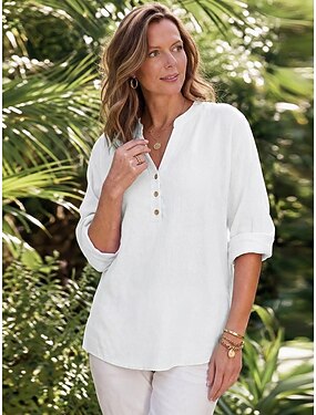 Damskie Bluzka %100 Pamuk Guziki Jednokolorowe Podstawowy Codzienny Rękaw 3/4 W serek Zwykłe topy Codzienny Czarny Biały Czerwony Morelowy Lato Wiosna Jesień