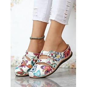 Damskie białe, swobodne sandały na klockowym obcasie z kwiatowym wzorem – wygodne, wsuwane, grube obcasy do noszenia na co dzień, na spacery, w podróże, na przyjęcia ogrodowe, do pracy &weekendowe