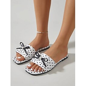 Damskie sandały w groszki z kokardką – urocze, wsuwane płaskie klapki z perłową kokardką, codzienne, szykowne kapcie na basen, do hotelu, kurortu i na letnie wakacje