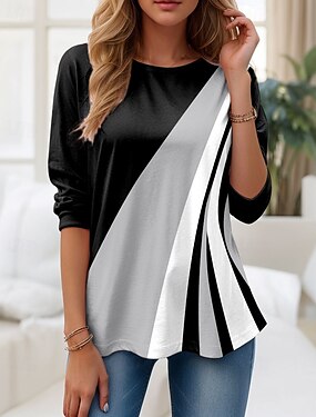 Damskie Podkoszulek Z wycięciem Nadruk Graficzny Kolorowy blok Geometria Zabytkowe Elegancki Klasyczny Długi rękaw W serek Zwykłe topy Codzienny Czarny i biały Jesień Zima
