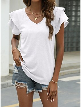Damskie Podkoszulek Koszulka Falbana Równina Moda Elegancki Klasyczny Krótki rękaw W serek Zwykłe topy Codzienny Wyjściowe Weekend Niebieski Czarny Biały Jasnozielony Rumiany róż Lato Wiosna