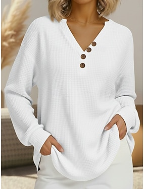 Damskie Koszula Swetry w wafelkowatej dzianinie Jednokolorowe Elegancja Elegancki Klasyczny Długi rękaw Henley Zwykłe topy Codzienny Sport Weekend Czarny Biały Żółty Czerwony Pomarańczowy Lato Wiosna
