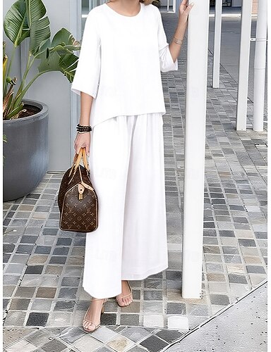 Damskie Pamuk Karışımı Komplety lniane bawełniane Zestawy spodni Rękaw 1/2 Półgolf Okrągły dekolt Równina Niejednolita całość Elegancja Moda Moda miejska Codzienny Na zewnątrz Czarny Biały Rumiany róż