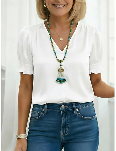 Damskie Bluzka Z marszczeniami Równina Elegancja Elegancki Krótki rękaw W serek Zwykłe topy Codzienny Na zewnątrz Święto Niebieski Czarny Biały Jasnozielony Rumiany róż Lato Wiosna