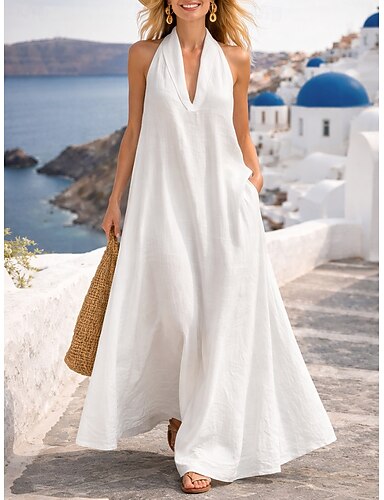 Damskie Sukienka maxi Codzienne sukienki Sukienka A line Sukienka z imitacji lnu Moda Nowoczesny Codzienny Urlop Wyjściowe Luźna Równina Długi rękaw Kantarka Niebieski Biały Wino Zielony Lato Wiosna