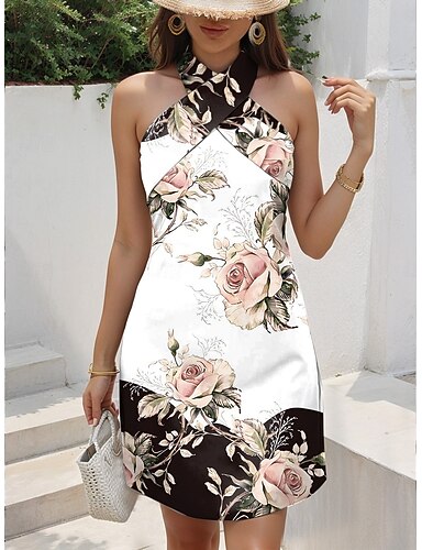 Damskie Sukienka mini Sukienka letnia Sukienka A line trykotowa sukienka Urlop Codzienny Wyjściowe Regularny Kwiaty Graficzny Bez rękawów W serek Niebieski Czarny Biały Zielony Lato