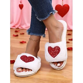 Damskie różowe, pluszowe klapki ze sztucznego futerka z czerwonym brokatowym serduszkiem – urocze, ciepłe kapcie domowe na prezent walentynkowy, do sypialni i salonu