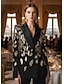 czarno-złota damska marynarka sportowa w dobrym stanie &rozkloszowana, formalna suknia ślubna z satyny z cekinami, elegancka, z długim rękawem i szpiczastymi klapami, dwurzędowa