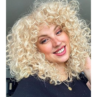 Kręcone peruki blond z grzywką ombre blond kręcone peruki dla kobiet odporne na ciepło syntetyczne peruki modna kobieca klasyka blond Halloween