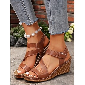 Damskie beżowe sandały na koturnie z paskami na krzyż – letnie buty na platformie z odkrytymi palcami do ogrodu, na zewnątrz, na wakacje i na co dzień