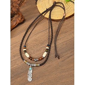 męski naszyjnik w stylu boho z podwójną warstwą, stop metali i woskowany sznurek, zawieszka z piórkiem, koralikowy naszyjnik do codziennego noszenia, na wakacje na plaży i do stylizacji w kurorcie