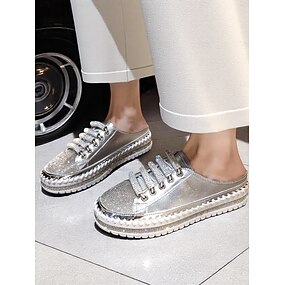 Damskie, srebrne, brokatowe, wsuwane buty na platformie — zdobione kryształkami, z amortyzowaną podeszwą, błyszczące, gotowe na imprezę, wieczorne wyjścia, festiwale i koncerty