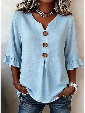 Damskie Bluzka Falbana Guziki Jednokolorowe Elegancki Podstawowy Codzienny Rękaw 3/4 W serek Zwykłe topy Codzienny Niebieski Biały Granatowy Zielony Lato Wiosna Jesień
