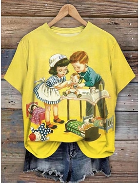 Damskie Podkoszulek Nadruk Zabytkowe Codzienny Krótki rękaw Okrągły dekolt Zwykłe topy Codzienny Żółty Lato