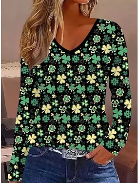 Dzień Św. Patryka Damskie Podkoszulek Nadruk Graficzny koniczyna Zabytkowe Elegancki Klasyczny Długi rękaw W serek Zwykłe topy Codzienny Czarny Wiosna Jesień