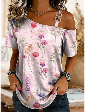 Damskie Podkoszulek Asymetryczny/a Kwiaty Graficzny Zabytkowe Tropikalny Hawajskie Krótki rękaw Na jedno ramię Asymetryczna szyja Zwykłe topy Codzienny Sport Wyjściowe Żółty Rumiany róż Fioletowy