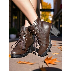 Damskie brązowe, sznurowane botki na grubym obcasie – styl bojowy ze sztucznej skóry z bocznym zamkiem i klamrą, idealne do jesiennych stylizacji, aktywności na świeżym powietrzu i swobodnego noszenia na mieście