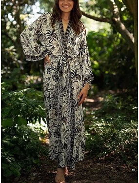 damska sukienka maxi z kwiatowym dekoltem w serek, długi rękaw, lato, wiosna