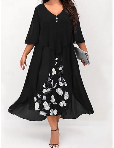 Damskie Puszysta Codzienne sukienki Kwiaty W serek Rękaw 3/4 Wiosna Jesień Elegancja Moda Nowoczesny Codzienny Sukienka midi Codzienny Święto Sukienka