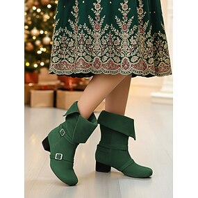 Damskie zielone buty do połowy łydki z klamrą - buty w stylu retro w stylu elfa ze składanym wzorem, moda świąteczna w stylu vintage na zimowe imprezy
