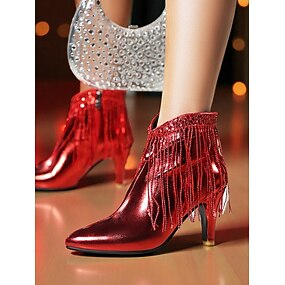 Damskie czerwone metaliczne botki z frędzlami - błyszczące, spiczaste noski, botki na obcasie, idealne na imprezy taneczne, wieczorowe i koktajlowe