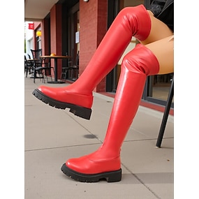 Damskie czerwone, grube kozaki za kolano, wykonane z gładkiej skóry ekologicznej, z platformową podeszwą, idealne na co dzień, do stylizacji ulicznych i na jesień/zimę