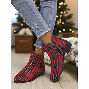 Damskie botki świąteczne w czerwoną kratkę – w stylu tartanowym w kolorze czerwonym i zielonym, zapinane na zamek błyskawiczny, stylowe i wygodne obuwie świąteczne na przyjęcia i spotkania świąteczne