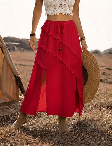 Damskie Spódnica wakacyjna Moda Codzienny Midi Wysoka talia Spódnice Równina Falbana Średnio elastyczny Codzienny Ulica Czarny Rumiany róż Zieleń wojskowa Czerwony Lato Poliester