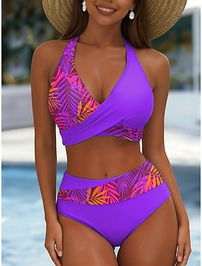 Kobiety Bikini 2-częściowy Kostium Kąpielowy Wysoki Stan Bez Pleców Wakacyjny Strój Plażowy Graficzny Tropikalny V Neck Bez Rękawów