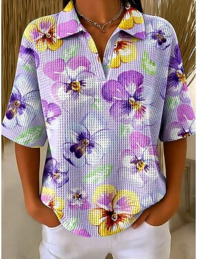 Damskie Koszulka z goframi Teksturowane swetry z dzianiny Prążki Graficzny Geometryczny Elegancja Zabytkowe Elegancki Rękaw 1/2 Kołnierz polo Zwykłe topy Codzienny Niebieski Biały Fioletowy Lato