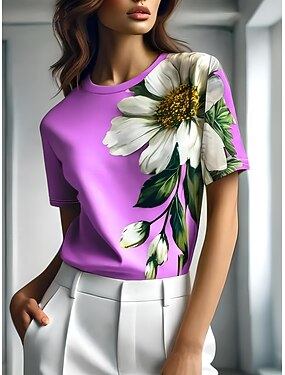 Damskie Podkoszulek Nadruk Kwiaty Zwierzę Codzienny Krótki rękaw Okrągły dekolt Zwykłe topy Codzienny Fioletowy Lato Wiosna
