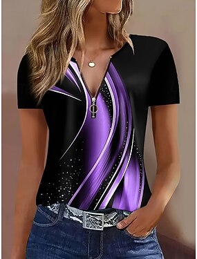 Damskie Podkoszulek Quarter Zip Graficzny Geometryczny Tropikalny Hawajskie Elegancki Krótki rękaw Półgolf Zwykłe topy Ślub na plaży Codzienny Sport Niebieski Fioletowy Lato Wiosna