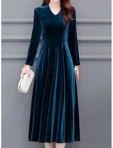 Sukienka midi z weluru dla kobiet sukienka w kształcie litery A elegancka na przyjęcia koktajlowa na świeżym powietrzu dla gości weselnych regularne dopasowanie jednolity kolor długi rękaw dekolt w