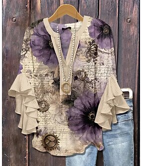 Bluzka damska z dekoltem w serek w kwiaty graficzna elegancka boho etniczna 3/4-sztukowe rękawy zwykłe bluzki codzienna wakacyjna ubranie na urlop print królewski niebieski niebieski jasny fioletowy