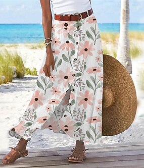 spódnice damskie bawełniane lniane modne casualowe maxi spódnice z wysokim stanem kwiatowy wzór rozdwojone końcówki casualowe codzienne jasnoróżowe żółte różowe niebieskie letnie