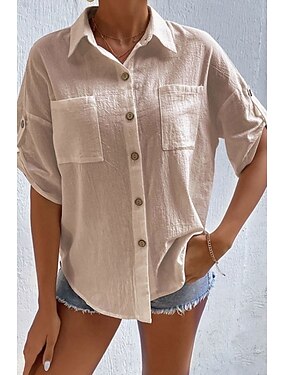 Damskie Koszula Zapiąć Bluzka Sztuczna bawełna len Kieszeń Guziki Równina Podstawowy Codzienny Krótki rękaw Kołnierzyk koszuli Zwykłe topy Święto Wyjściowe Czarny Biały Granatowy Khaki Szary Lato