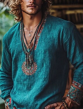 Męskie Koszula Koszula Popover Letnia koszula Koszula plażowa Niejednolita całość Urlop Święto Niebieski Długi rękaw Bez kołnierza Lato Wiosna Odzież Etniczne i religijne