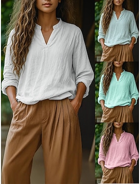 Damskie Koszule bawełniane lniane Bluzka Sztuczna bawełna len Jednokolorowe Elegancki Codzienny Długi rękaw W serek Zwykłe topy Codzienny Niebieski Biały Rumiany róż Zielony Lato Wiosna Jesień