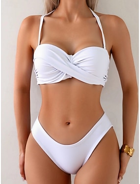 Kostium kąpielowy bikini damski 2-częściowy marszczony seksowny z wycięciem z tyłu wakacyjny strój plażowy jednolity kolor dekolt w serek bez rękawów