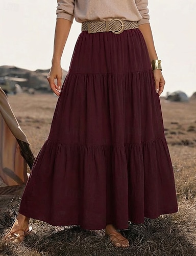 Damskie Spódnica z imitacji bawełny i lnu Moda Codzienny Maxi Średni Talia Spódnice Solidne kolory Z marszczeniami Falbana Nieelastyczny Codzienny Urlop Czarny Wino Fioletowy Brązowy Lato Poliester