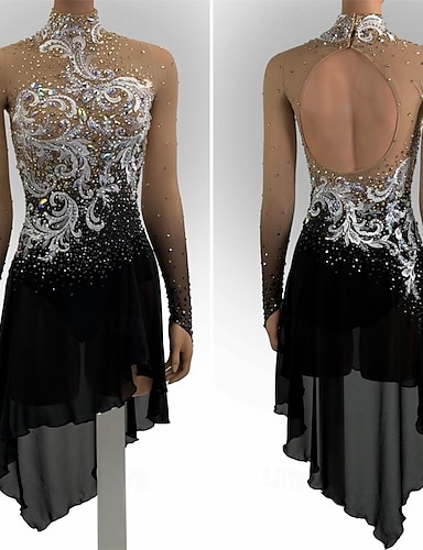 Sukienka łyżwiarska Damskie Bruslení Sukienka Czarny Niejednolita całość Otwór na kciuk Elastyczny Szkolenie Zawody Odzież łyżwiarska Klasyczny Kryształ / Kryształ górski Długi rękaw Łyżwiarstwo
