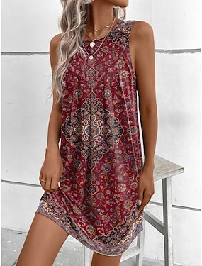Damskie Sukienka mini Sukienka Boho Codzienne sukienki Sukienka w kwiatki Elegancja Moda Nowoczesny Na zewnątrz Urlop Wyjściowe Regularny Kwiaty Bez rękawów Półgolf Niebieski Czerwony Fioletowy Lato