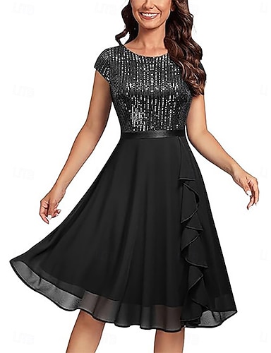 Damskie Sukienka do kolan Cekinowa sukienka Sukienka na imprezę Sukienka koktajlowa Elegancja Moda Nowoczesny Wieczorna impreza Impreza Ślub Regularny Równina Krótki rękaw Półgolf Niebieski Czarny