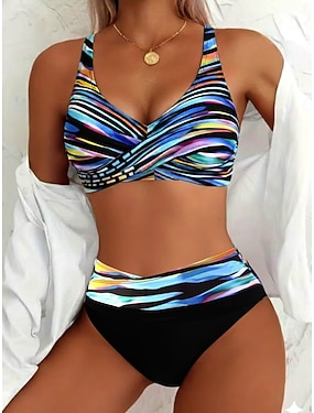 Kostium kąpielowy dwuczęściowy damski bikini wysoki stan modne stylowe graficzne w paski dekolt w serek bez rękawów