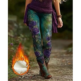 Damskie Getry Przytulne legginsy Zabytkowe Moda Moda miejska Pełna długość Wysoka taliaPantsŚwięta Kwiaty Graficzny Drukowanie Polar Keep Warm Wygodne Elastyczny Na zewnątrz Codzienne Zielony Jesie