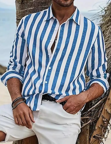 Męskie Letnia koszula Codzienna koszula Koszula plażowa Koszula z kołnierzykiem Zapinana na guziki koszula Koszule w paski Czarny Niebieski Fioletowy Brązowy Zielony Długi rękaw Naszywka Klapa Urlop