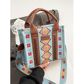 damska torba typu tote w stylu boho z nadrukiem etnicznym – inspirowana stylem vintage płócienna torebka ze skórzanymi akcentami, idealna na niezobowiązujące wyjścia i do codziennego użytku