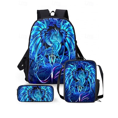 Zestaw plecaków dla chłopców z motywem smoka, składający się z trzech części, w tym plecaka, torby chłodzącej i piórnika, w jasnoniebieskim kolorze, idealny do szkoły, podróży i codziennego użytku, Ruth Thompson