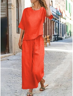 Damskie komplety z bawełny i lnu, zestawy do noszenia w domu, modne, codzienne, wygodne, w czystym kolorze, na co dzień, do domu, pomarańczowe, czerwone, granatowe, czarne, białe, ciemnozielone, wiosna, jesień