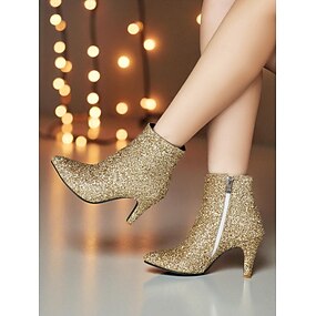 Damskie błyszczące złote botki na szpilkach – błyszczące, zapinane na zamek buty imprezowe na wieczorne wyjścia, do klubów i na koktajle